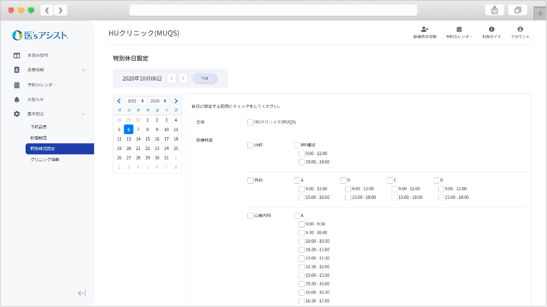 クリニック全体、医師・診察室、予約枠・予約時間など細かな単位で設定することが可能です。