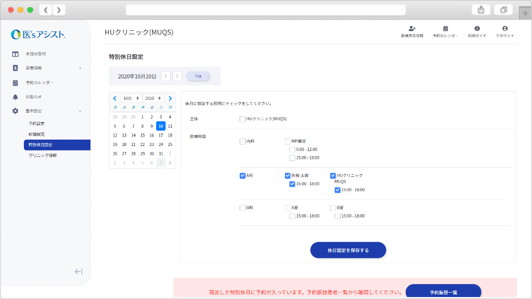 万が一、設定した特別休日にすでに予約が入っている場合に画面上でその旨を分かりやすく通知します。
