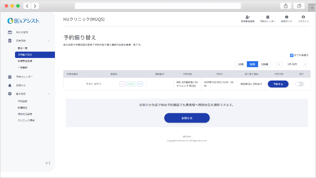 特別休日と予約が被ってしまった患者さんの情報を一覧で表示しています。