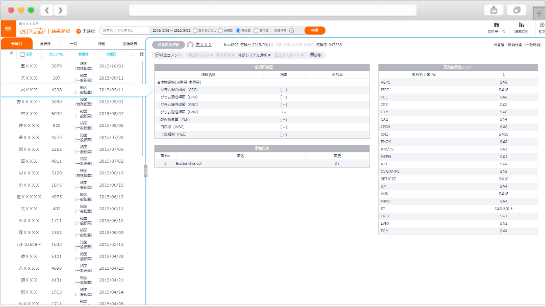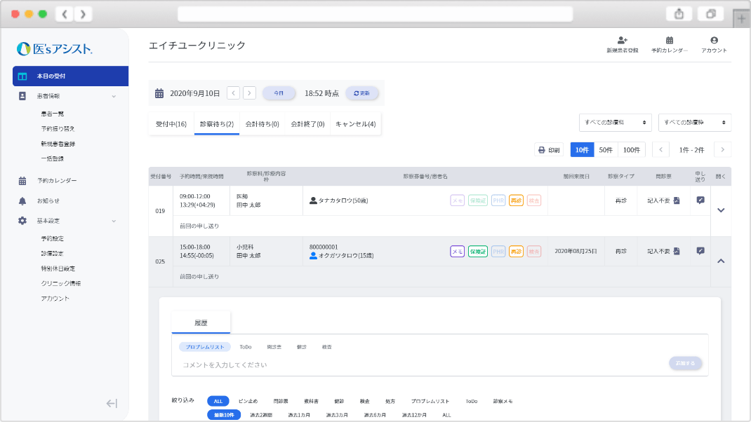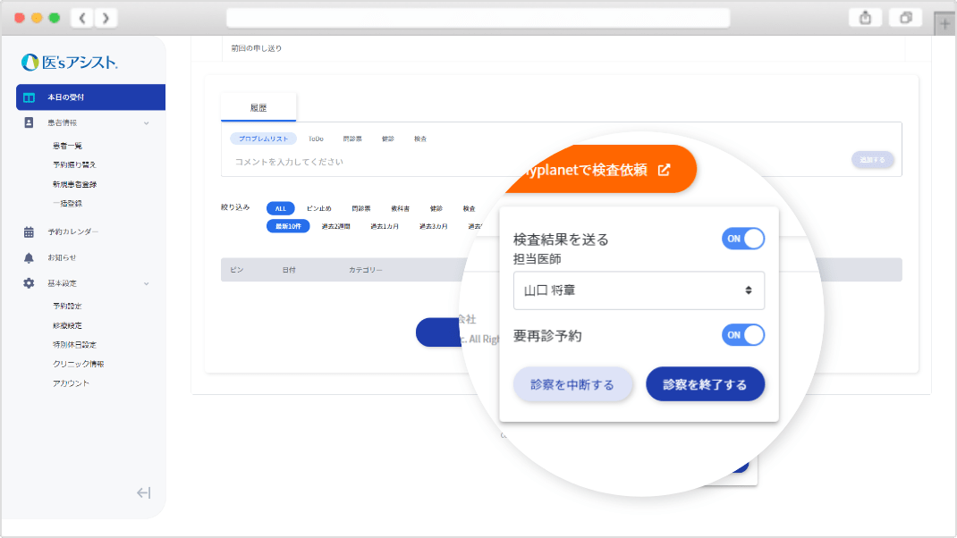 過去の診察内容や問診票、健診、検査、処方、プロブレムリストなど患者さん一人ひとりの細かな履歴データを確認できます。