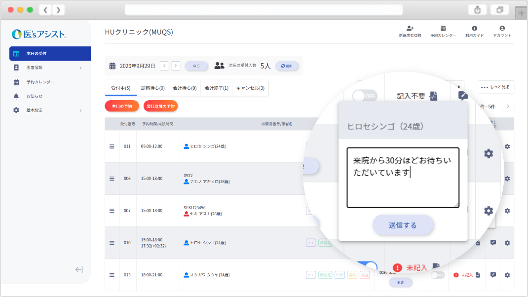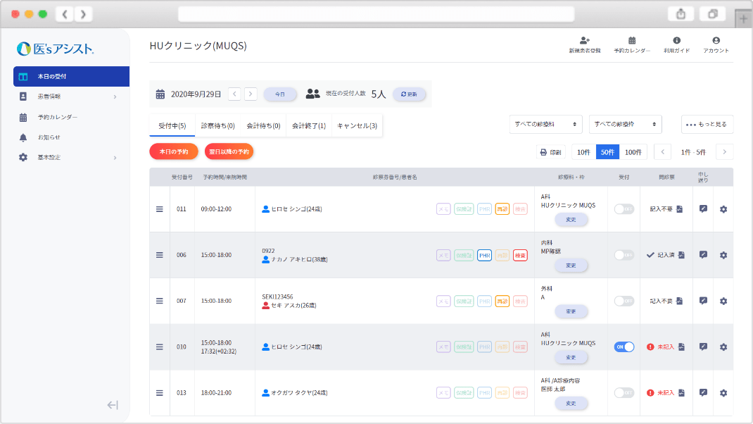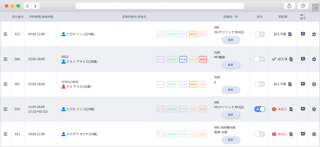 当日の受付患者さん一覧はもちろんのこと、保険証の提示が必要な方、問診票が未記入の方など各種情報が簡単に読み取れる画面となっています。