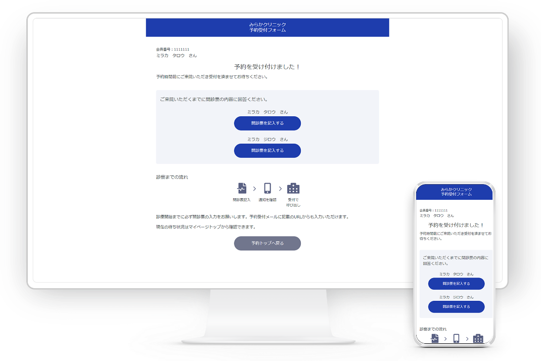 当日の予約であれば、予約完了画面からそのまま問診票の入力へ進むことができクリニックでの待ち時間を短縮できます。