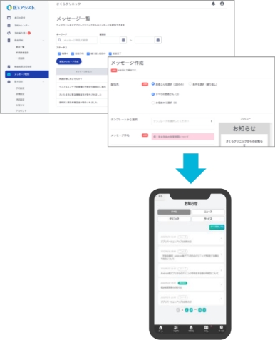 メッセージ配信機能で二次検査などのご案内やお知らせを直接患者さんに、送信先も条件を絞り込み簡単に設定できるのでスタッフの業務を効率化します